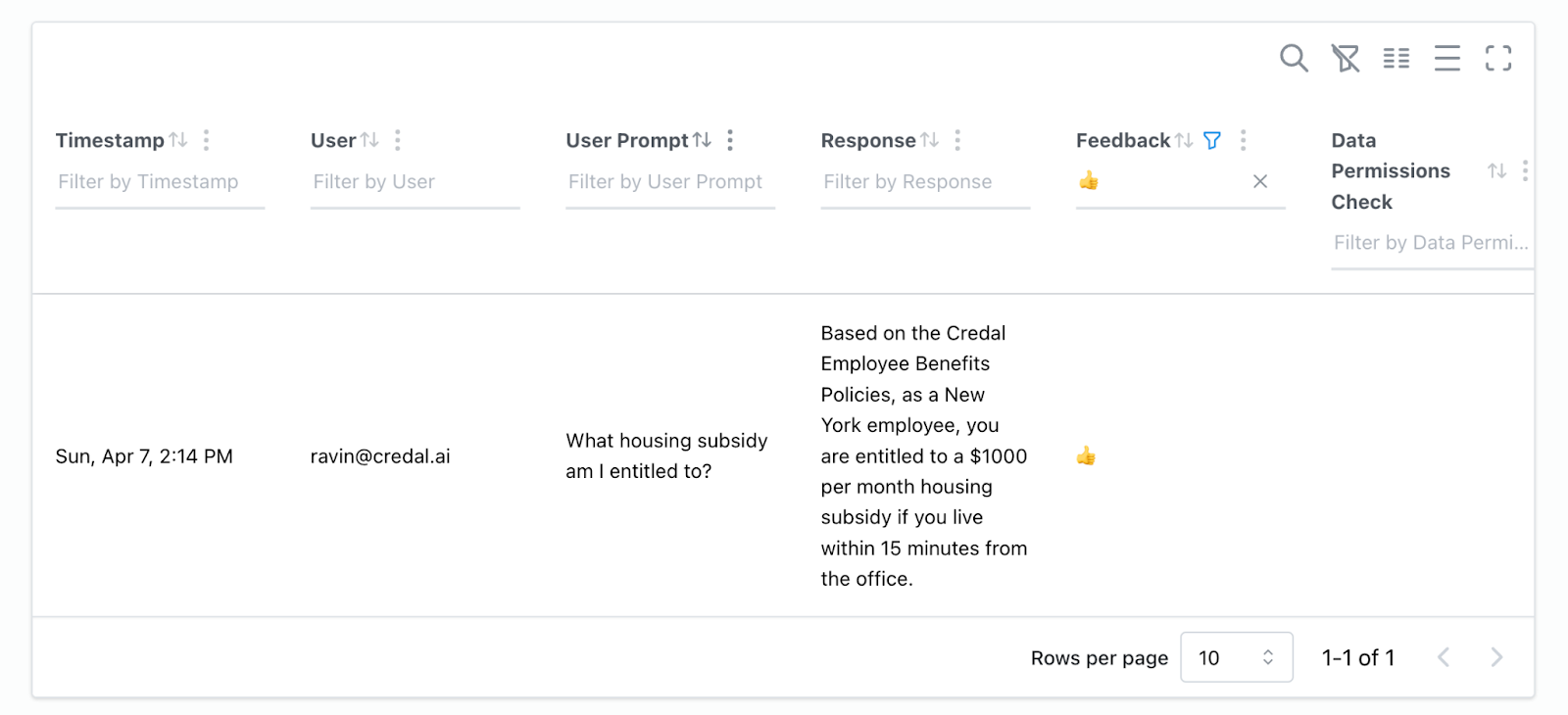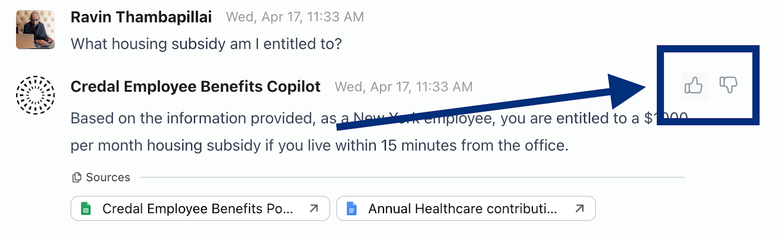 Secondly, the HR managers or subject-matter-experts (in this case likely the HR person responsible for the benefits program), needs a way to steer and control the responses. Ideally, they should be able to review the outputs, determine which results were good (or bad) and make sure the bad ones are corrected for future questions and make sure the good ones are used as a reference example when similar questions come up. In the long run, we’ll need to ensure that we can expire, delete or edit these reference answers, but for the sake of shipping an MVP quickly, you might want to skip some of that and solve those problems once the application has some traction at your organization. At Credal, we provide both APIs and UI elements (for those customers who are using Credal’s UI to serve their copilots) to submit feedback on any given response. The Subject Matter Expert can review the feedback, and mark certain responses as “good” or “bad”, which we can then feed back into the prompt so that the next end user can get a better response next time. You might even want to seed some example questions if you know what the most commonly asked questions are!