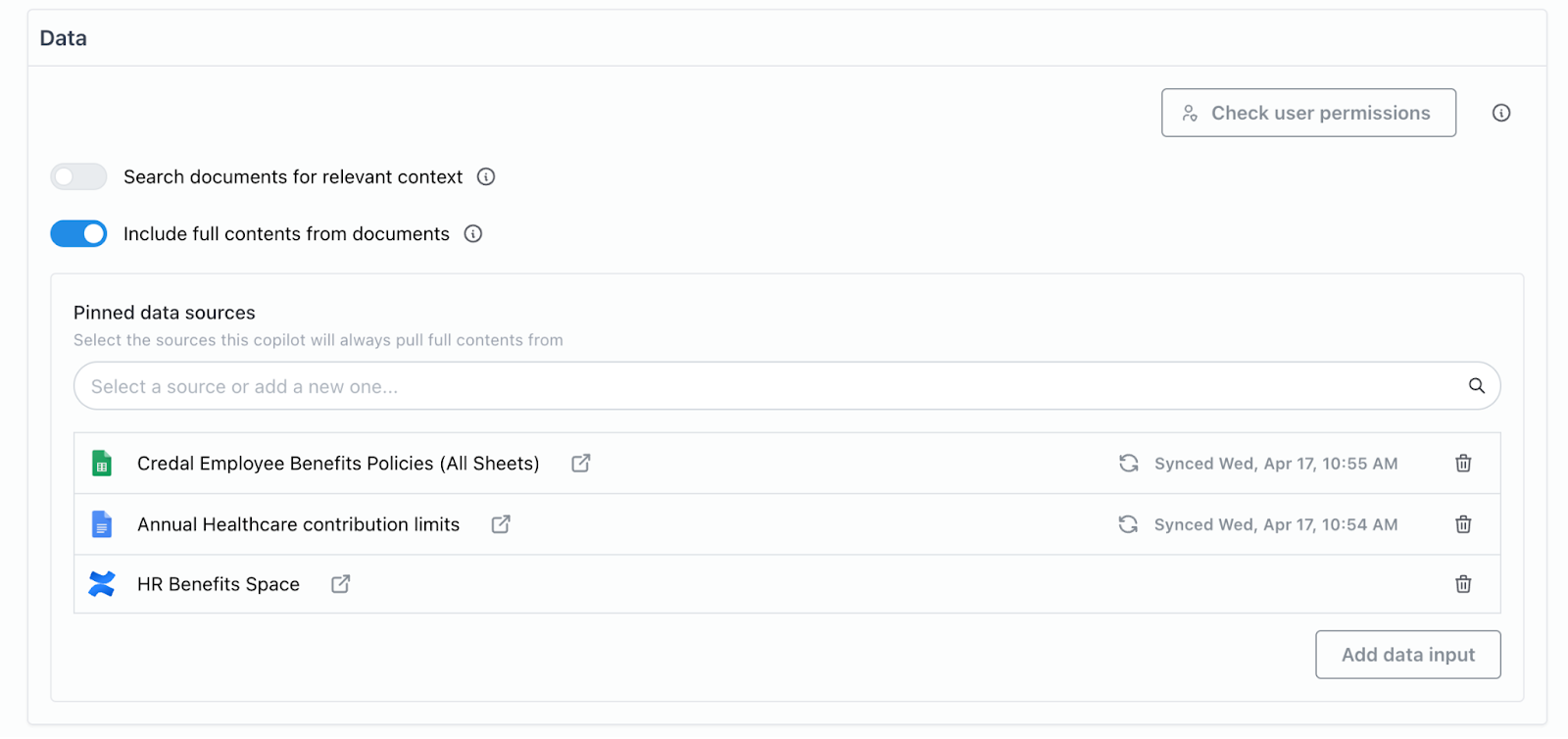 The way we think about this at Credal, assumes that the majority of the time, you’re going to want to inherit the permissions of the underlying source system. If you have to build that level of permissions integration in house, that can get really complicated, and so Credal helps make it extremely easy to inherit those permissions and use them in any application you choose to build, for the specific sources you want to connect.