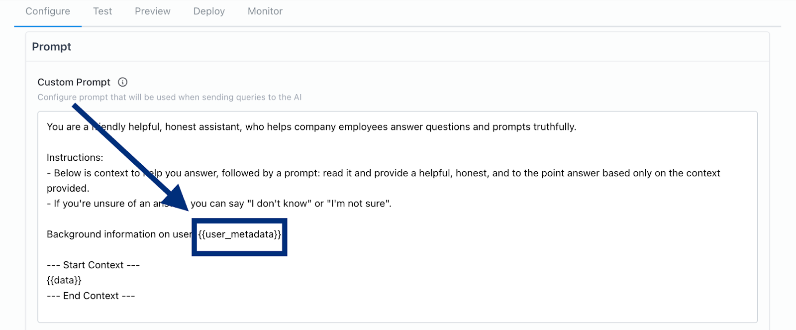 1. They’re personalized to the end user: an American asking about retirement savings policies gets an answer about the company’s 401k policy, the Brit gets an answer about the company’s pension plan. Credal supports this by letting you import each user’s HR data from your HRIs, (or directly via an API endpoint), and then you can pass that User metadata to help with retrieving the context relevant to this user and to help the LLM formulate the best personalized response to the end user.