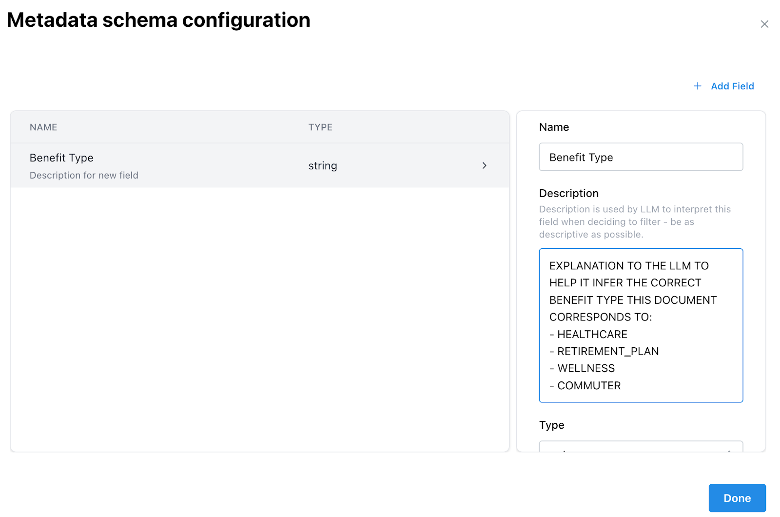 Above, you see you can provide a description of the field type, and an LLM can use that description to infer the best possible value for each given document you upload into this collection.