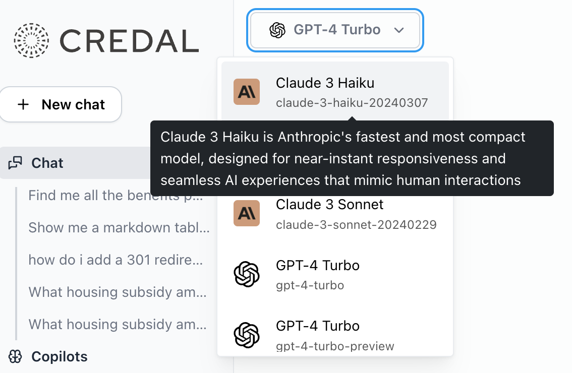 The way we've approached this at Credal is to give copilot creators a little dropdown, that contains just enough information for AI curious employees to configure copilots with the most relevant models for them. As new models come out, if you want to flip to the latest and greatest, you can just leave it to Credal to figure it out.