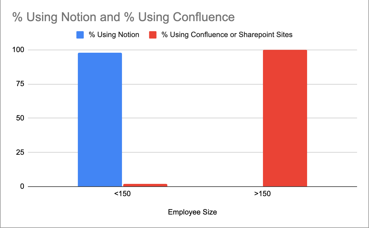 Most companies we speak to are using either Confluence, Sharepoint Sites or Notion to manage this. In fact, there’s a very stark line we see at which below a certain size, a company is almost certain to be using Notion, and above it, almost certain to be using Confluence.