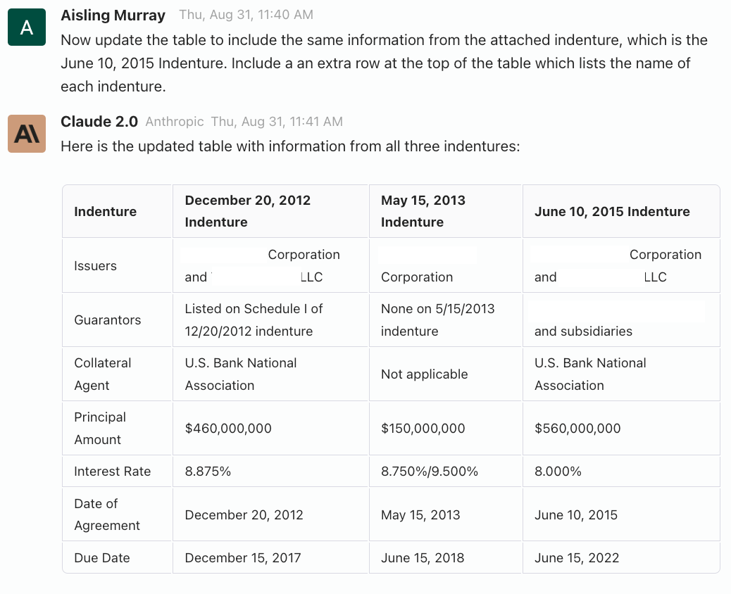 The result was impressive! In just five minutes, I had a table summarizing the key terms of each document, which I could paste into excel. I reviewed the responses, an essential step when working with generative AI systems, and good practice generally. I asked Claude to elaborate on the “subsidiaries” listed as guarantors to the June 10 indenture, as I felt that response was incomplete, and it responded with a full and accurate list. I then tasked it with providing some more complex information, which it accomplished in seconds.