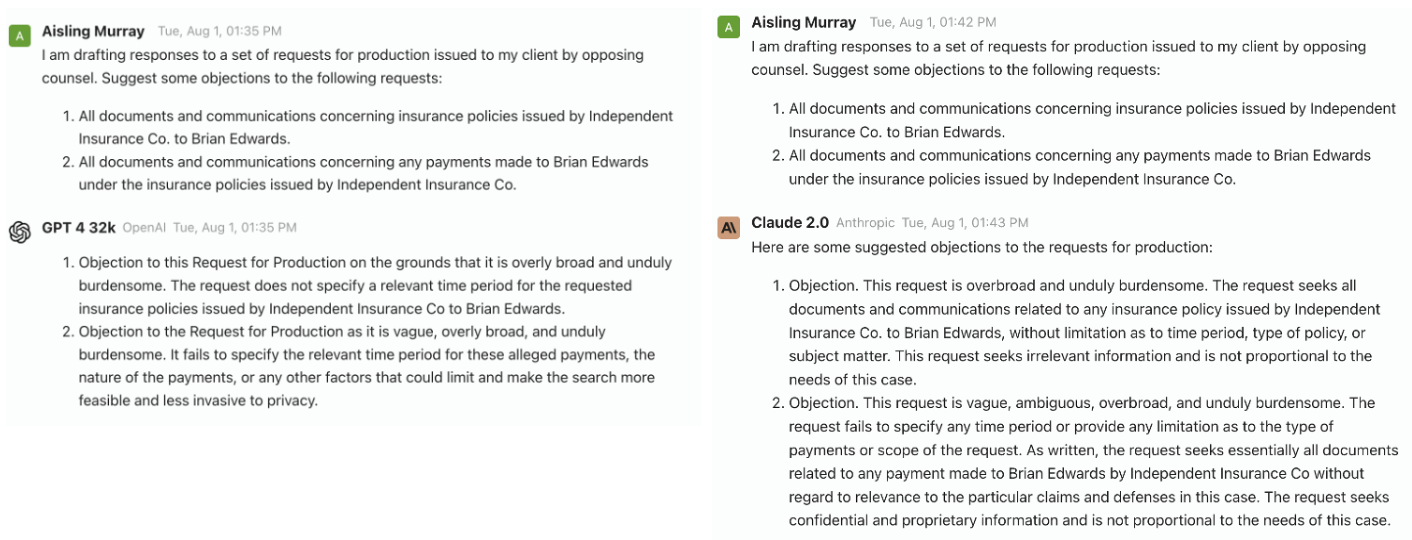 These tools are particularly proficient at routine legal writing tasks. In the below example, I asked GPT and Claude to weigh in with some objections to a set of discovery requests. The responses closely tracked typical objections raised by lawyers, picking up that the requests were over-broad and explaining why.