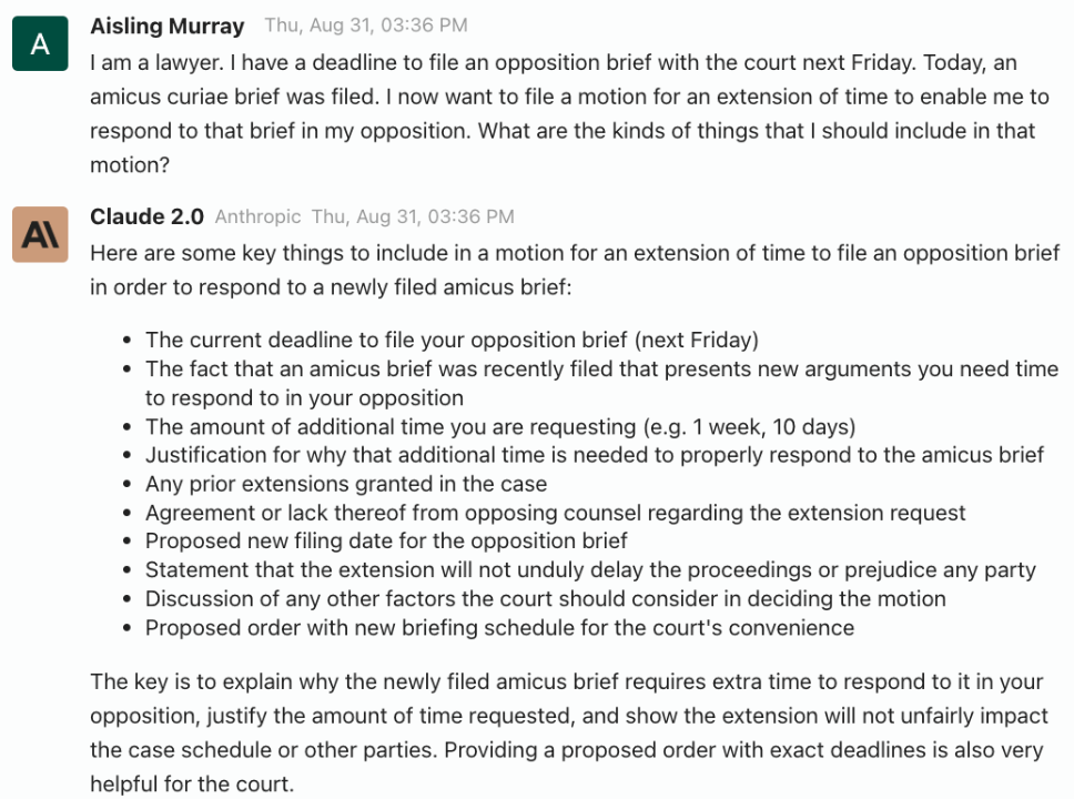 AI tools can also provide powerful support when it comes to brainstorming ideas or navigating new tasks. This holds especially true in a world that embraces remote work; having an AI assistant can be a crucial resource where junior associates can no longer reliably find a mentor in the next office. These tools can provide ideas, answer questions, or suggest a structure for written work. In the next example, I asked Claude how I might go about drafting a motion requesting extension of a deadline.