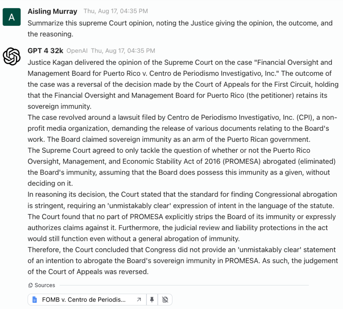 In this example, having read the opinion, I prompted GPT to provide additional relevant information that I felt was important to highlight. I could then edit this information and add my own analysis. A productive process for working with GPT to produce a summary looks something like this: