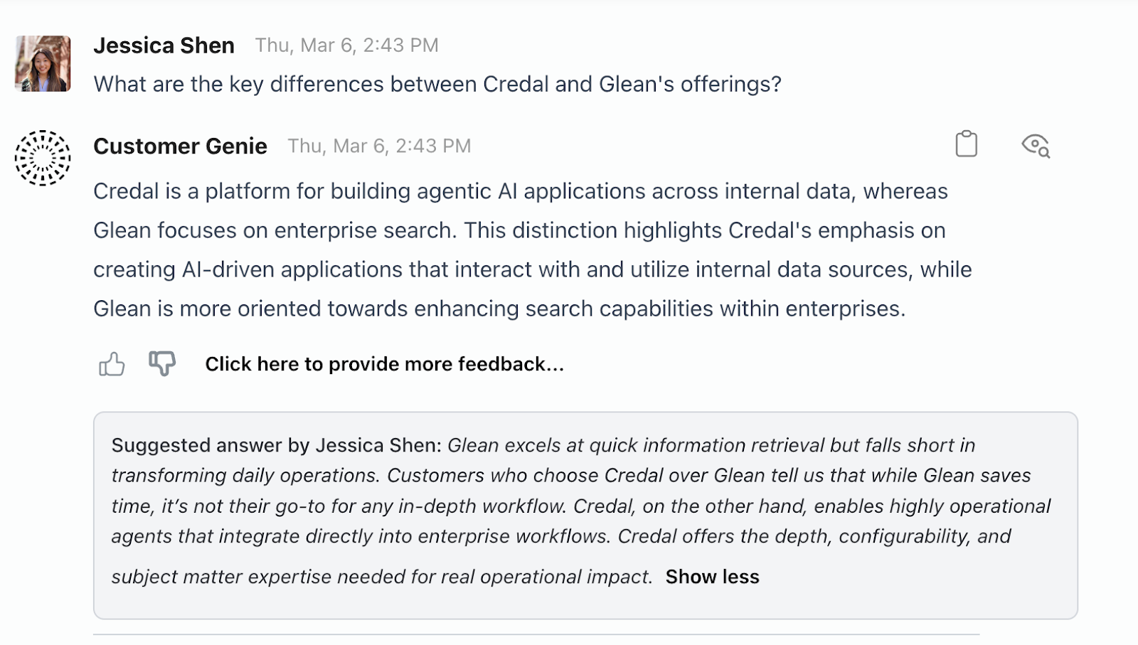 First, I ask the agent for the differences between us (Credal) and a competitor.