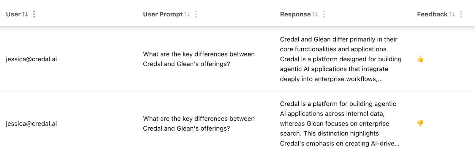 Every feedback response is logged for full visibility, so that any collaborators of a copilot (or even any user!) will be able to see exactly how the copilot behaved and why.