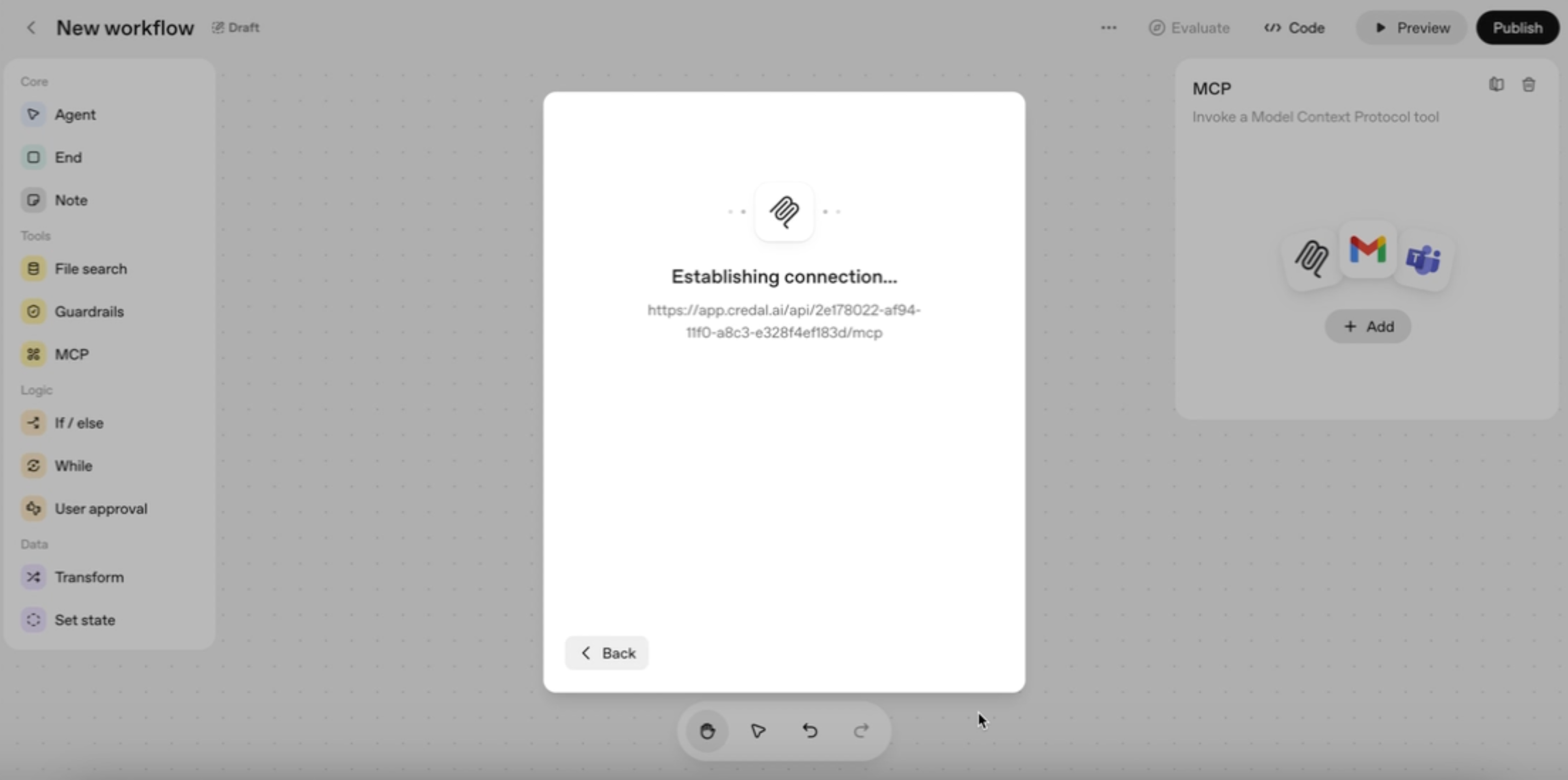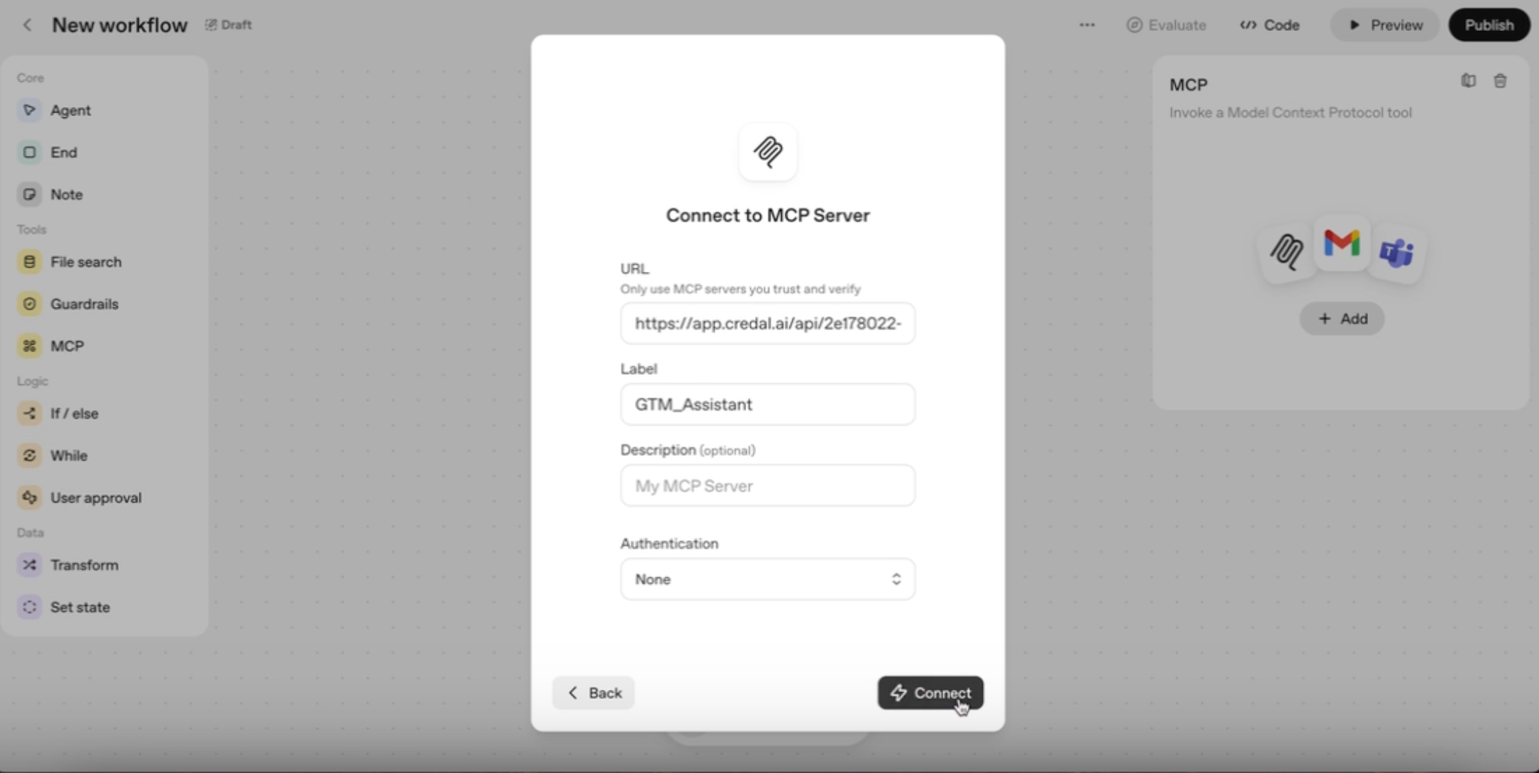 To connect Credal, an enterprise agent orchestration platform, with OpenAI, you’ll need to provision an MCP server URL from your Credal account.