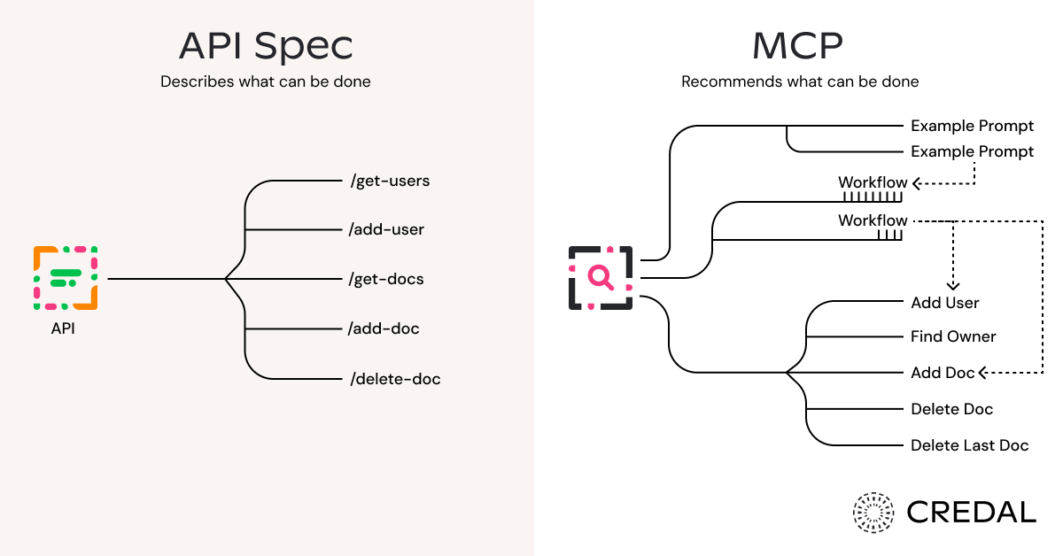 While slightly reductive, this is how first-party MCP servers work. They don’t actually help businesses solve big problems, just automate little actions. To better understand this, let’s differentiate the purpose of MCP and an API specification.