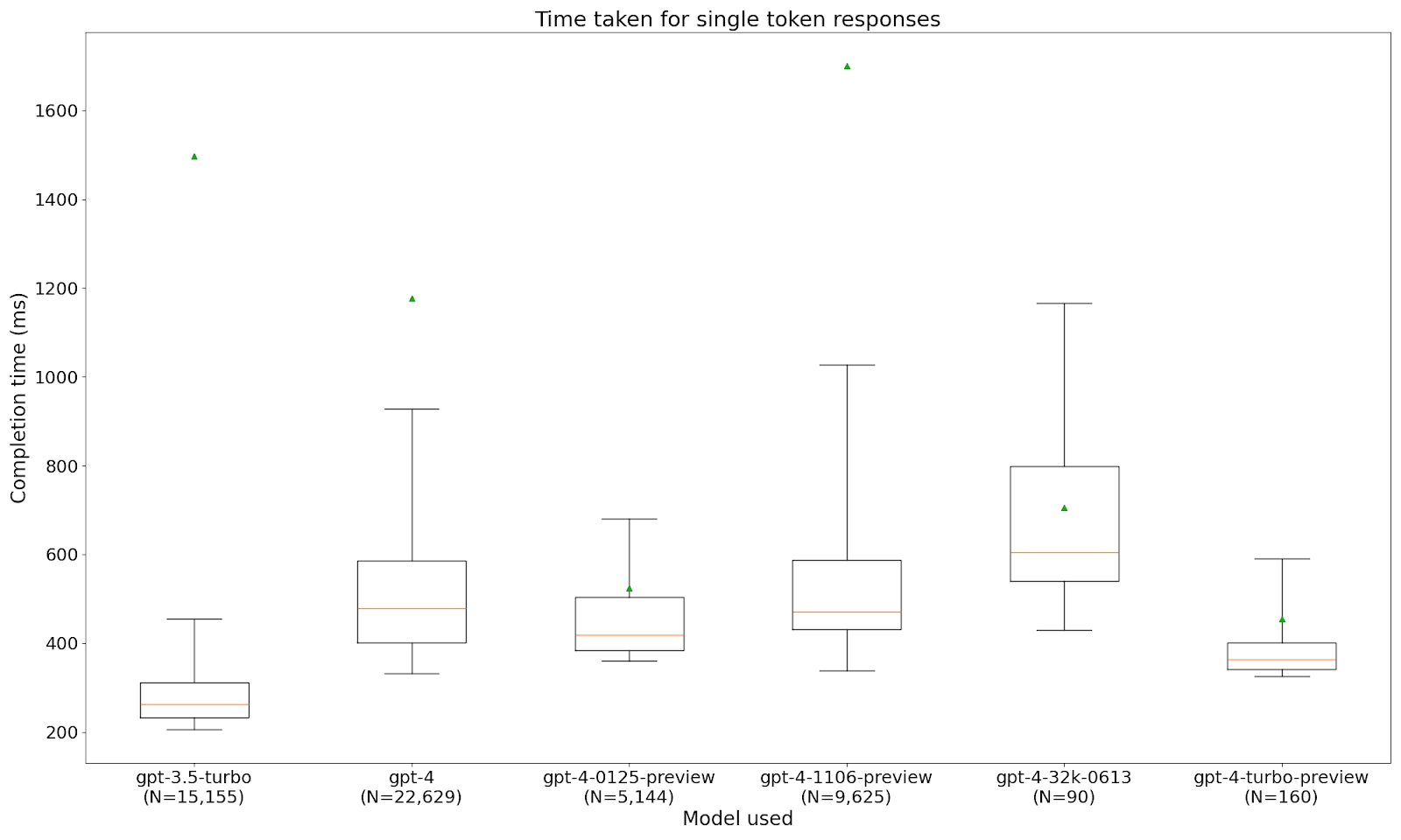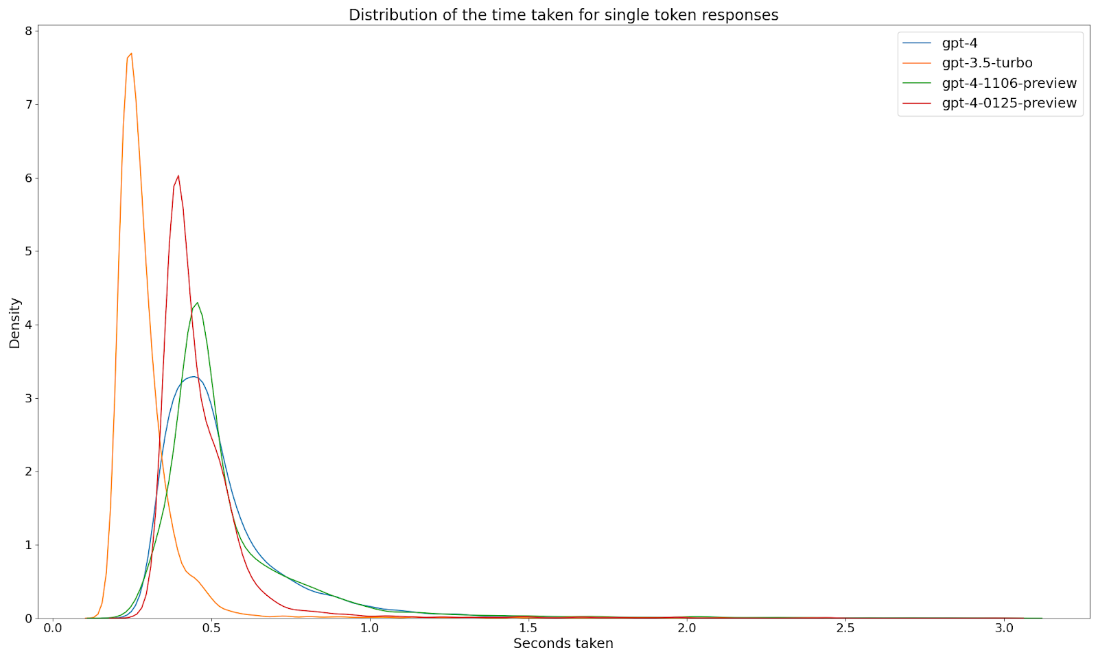 For single token responses, GPT-3.5-turbo is actually the quickest model, consistently outperforming any of the GPT-4 flavours (though it’ll be interesting to see how 4-turbo pans out). Fascinatingly, on this metric, GPT-4-32k - is far slower than gpt-4-turbo, an exact reversal of the metrics we saw before. That suggests that somehow it has slower startup costs, but its throughput on completion tokens is much better than GPT-4-turbo.