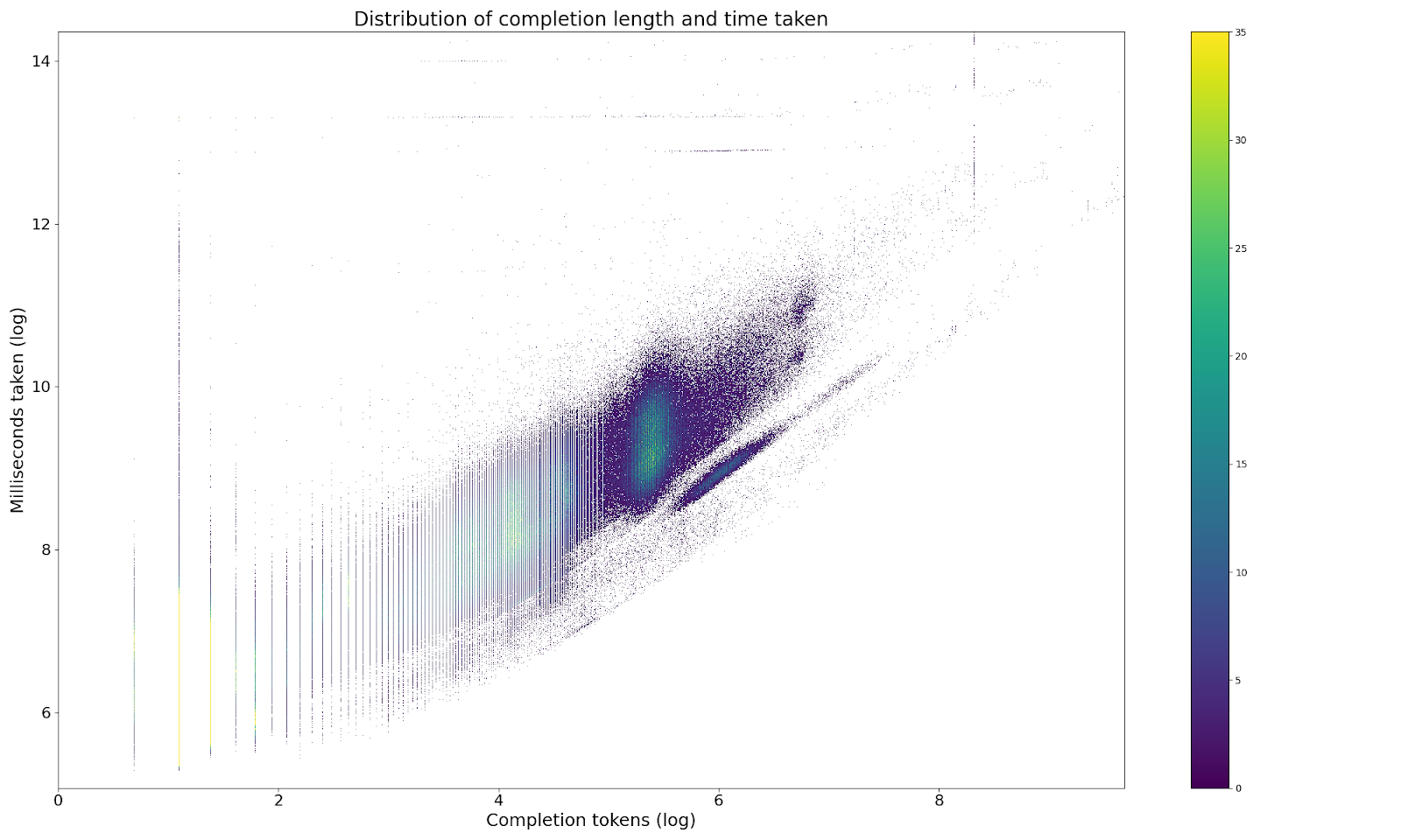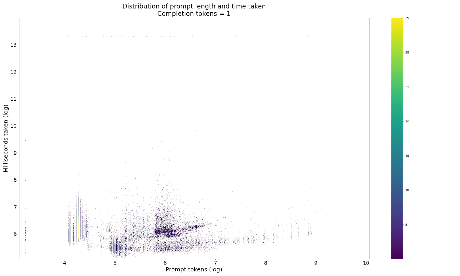 Here, aside from just looking at the coefficients of the linear model (and finding them tiny) we can fix the number of completion tokens and look at how the time taken varies with the number of prompt tokens. These are mainly included because the graph above looks like an aerofoil which is pretty cool. But anyway, if you wanted confirmation that the number of prompt tokens doesn’t really make a difference to the speed of the query, the correlation between prompt length and completion time when fixing the number of completion tokens ranges between -0.02 and +0.01 for completion tokens <= 4. Looking at the longer end of things, completion tokens of 64 gives us a stronger correlation (0.24) but hardly looks conclusive. Might be worth poking about here to see if there are non-linearities at play. But otherwise, don’t stress on the prompt length.