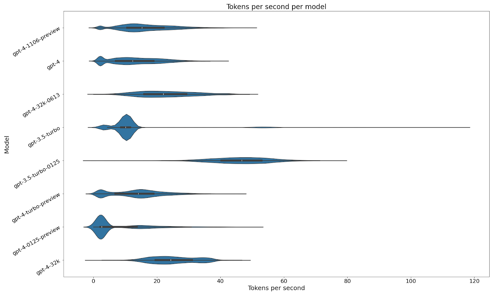 One of the things that's extremely interesting to me about this chart is just how well the gpt-4-32k models perform from a tokens per second perspective.(admittedly at much, much higher cost). Moving from GPT-4 to GPT-4-Turbo might net you an extra one or two tokens per second for normal, 20+ token responses, but moving to GPT-4-32k might get you 10-15 extra tokens per second, on average. Depending on the nature of your chatbot, if the average response length is relatively short say, say, about 100 tokens, then moving from GPT-4 to Turbo is going to move your average completion time from a little over 6 seconds to a little under it. But moving to GPT-4-32k is going to move your average to about 4 seconds.That being said, IIRC OpenAI are planning to move GPT-32k to consume from the turbo endpoints eventually. Now I don't know exactly what you’re getting from this graph, but I want to talk to you about why “tokens per second” might be a misleading metric for you. And it’s basically the start-up cost (that awkward intercept). We have a pretty major use case that results in many many queries giving quite short responses. And those queries all go through gpt-3.5-turbo. So you’ll actually see that GPT-3.5-turbo appears to be one of the slower models.