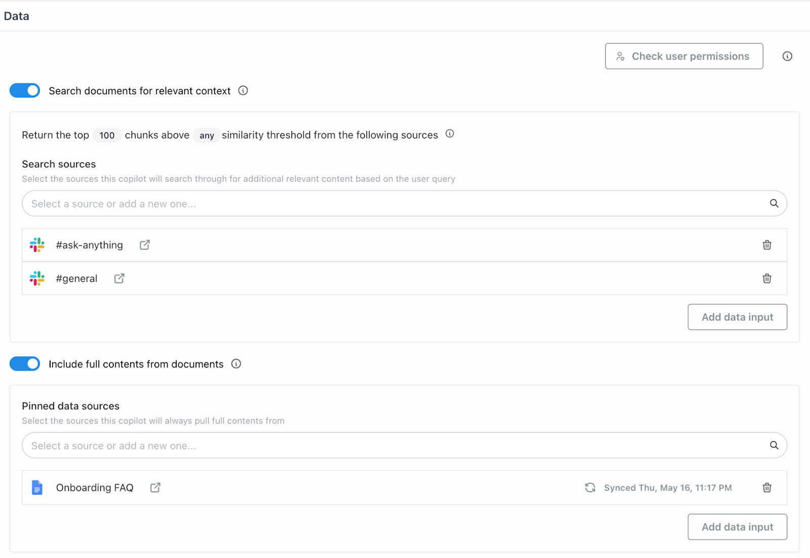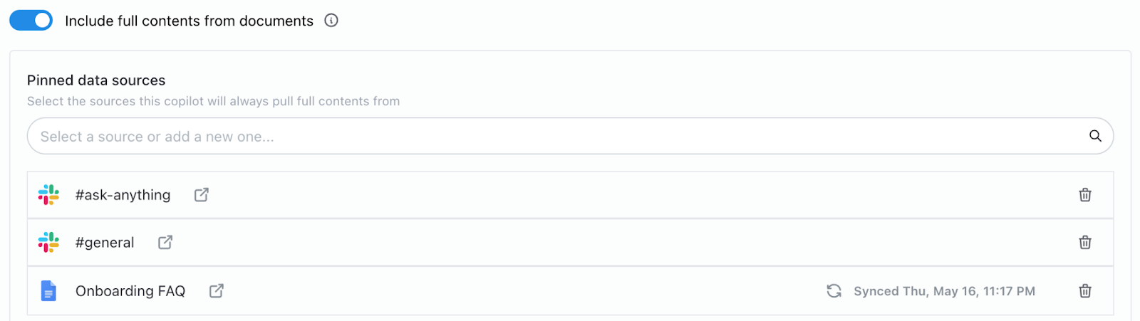 Pinned sources configure the copilot to include the entirety of a document in the context window when generating a response.