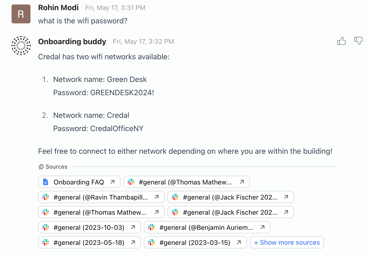 This was a fun and educational project, allowing me to get acclimated in my first week, using our own product. Thanks for following along! While Credal is a smaller company, you may have more data sources (Notion, JIRA, Confluence, etc. are examples that we support out-of-the-box) that you’d like to pull from, so feel free to reach out to me and I’d be happy to help with any questions, rohin@credal.ai.