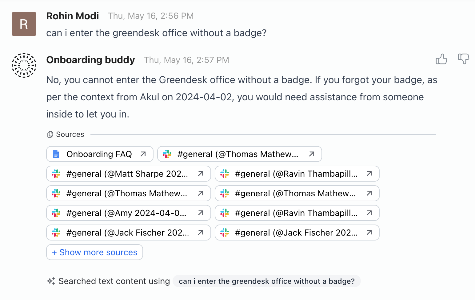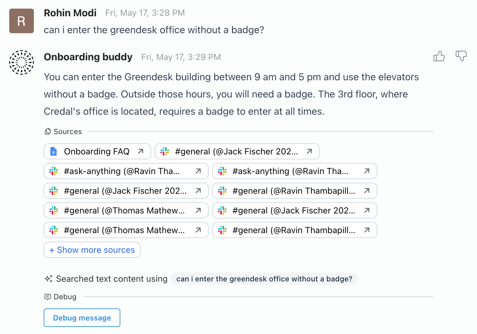 Success! The LLM was given the relevant data from the Onboarding FAQ, along with some of the slack channel messages retrieved by Credal and was able to generate an accurate answer.