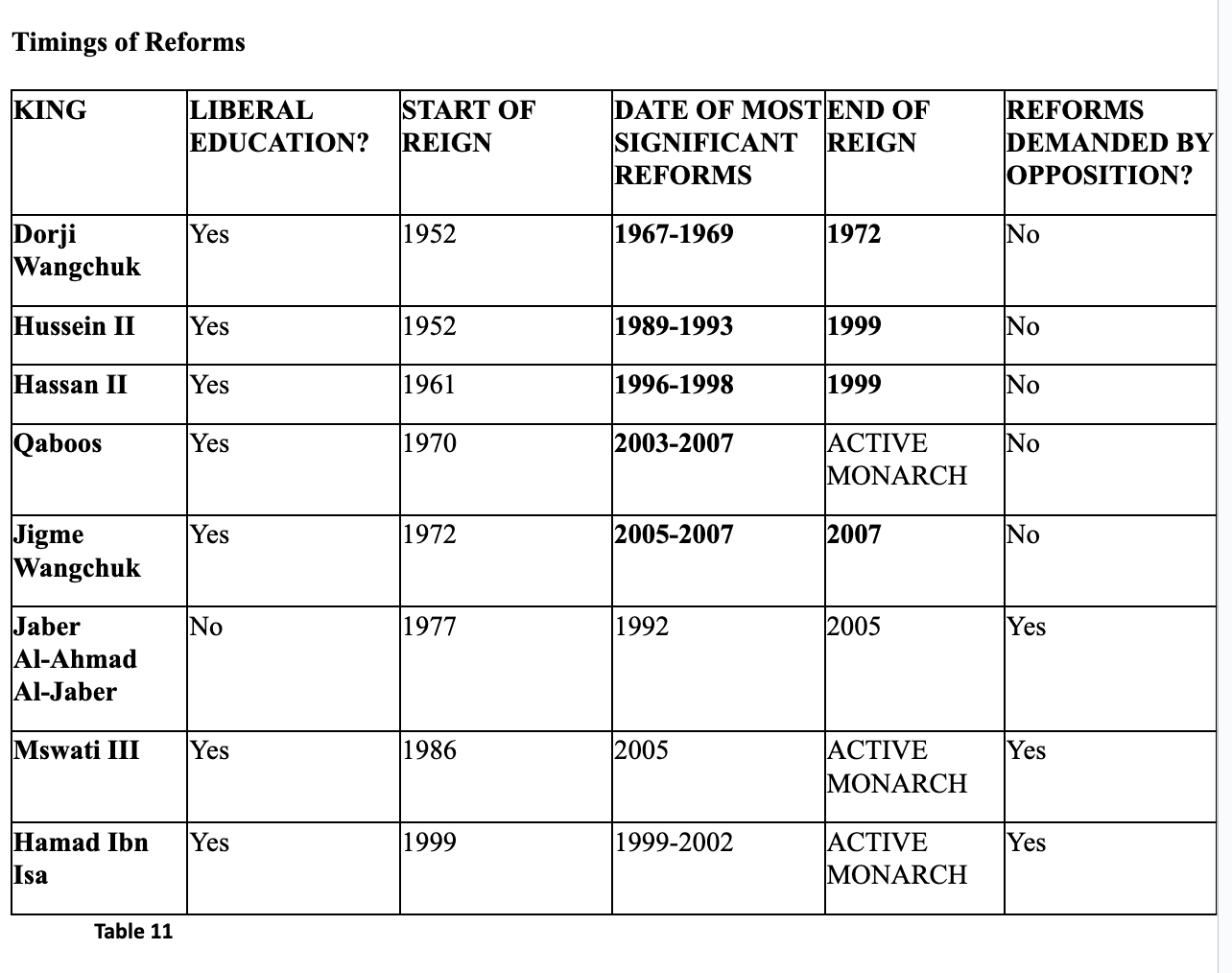 “According to table 11, there were three monarchs who began their reign between 1970 and 1980. These monarchs are Qaboos bin Said of Oman, who began his reign in 1970, Jaber Al-Ahmad Al-Jaber Al-Sabah of Kuwait who started in 1977, and Mswati III of Swaziland, who assumed power in 1986. Out of these three, only two faced significant opposition demanding reforms: Qaboos bin Said and Mswati III.”