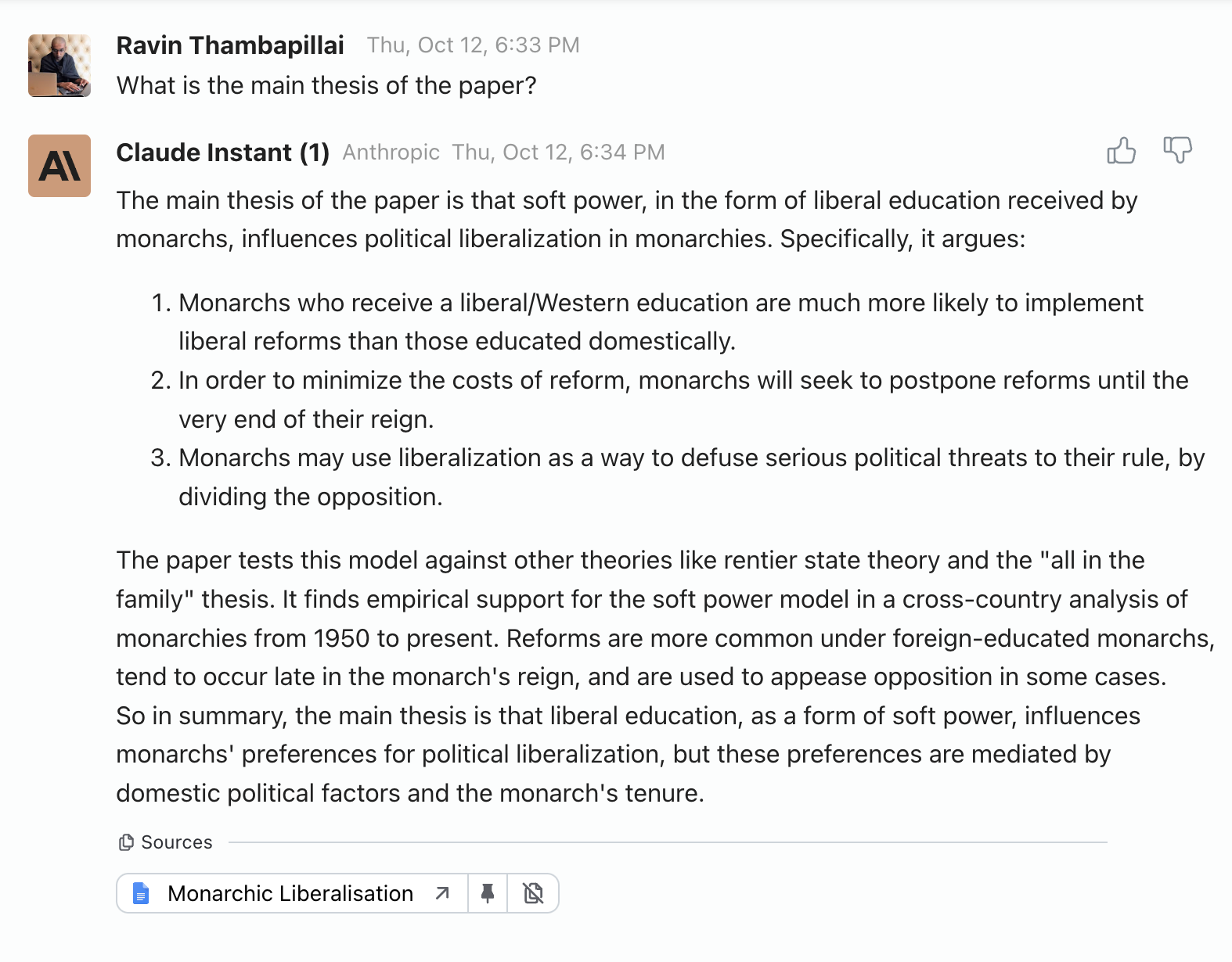 That’s not wrong exactly, but it doesn’t give me much information about what the thesis is. The right answer is approximately, “The main thesis is that soft power seems to influence whether countries implement reforms, since monarchs who were educated as children in western countries were more likely to implement liberal reforms, and they did this either when faced with public opposition or after they turned about 65.”