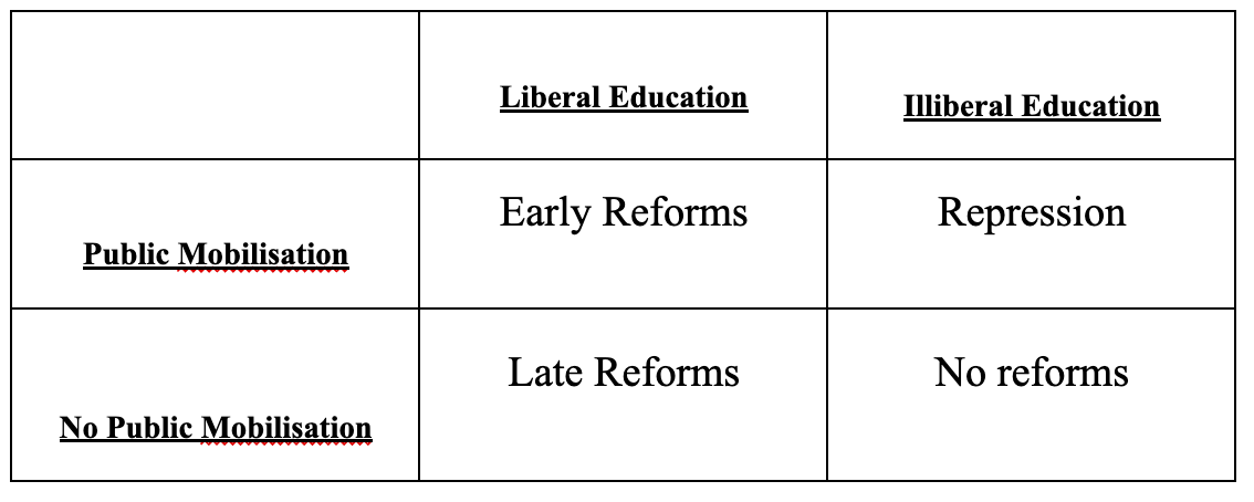 “In brief, this model has as its dependent variable, political liberalisation. The independent variables influencing the outcomes are; 1) the presence of mass public opposition to the monarchy and 2) the King’s education, (whether it was foreign/liberal or domestic). The two key actors are the ruling monarch and political opposition, which may consist of social groups and or political parties. The argument forms three stages, which are summarized as propositions above and in graphical form in figure 1 below.”
