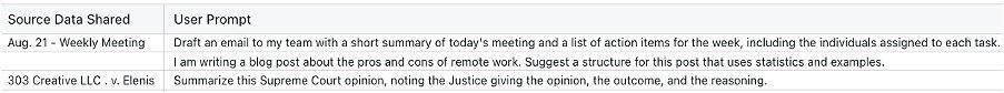 Rather than analyzing audit logs, organizations may turn directly to their employees to find out how they are putting AI tools to work. While conversations or surveys can be efficient ways to collect information, they have drawbacks. Responses may be coloured by memory or the availability bias, whereby we over-index on information that readily comes to mind, rather than responding in the most helpful or accurate way.[iii] The result is that employees will likely report on their recent, or perhaps most memorable, experiences with AI tools, rather than necessarily the most useful. The good news is these constraints can be overcome by referencing relevant data.[iv] So if employees are instructed to review their audit logs before responding, they will likely provide a better answer.