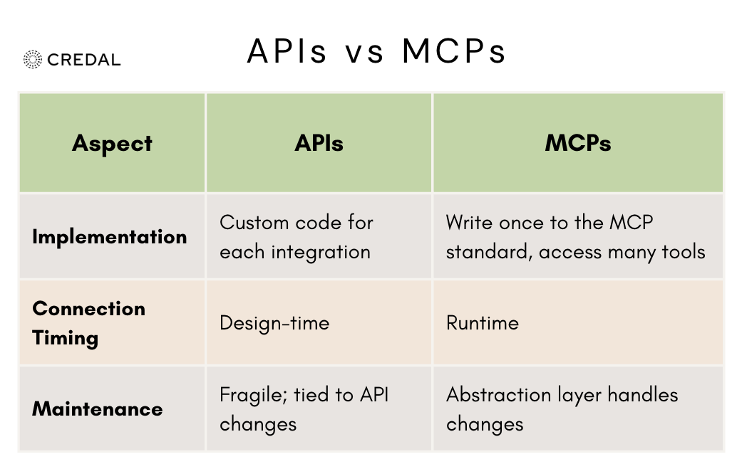 Traditional APIs were built for deterministic, pre-defined interactions; MCPs, on the other hand, enable dynamic, context-aware collaboration between AI agents and tools. They solve for a fundamentally different problem where the caller is a reasoning machine that has the ability to figure things out on the fly. This flexibility means that AI can adapt to different tools, offering more scalable integrations.