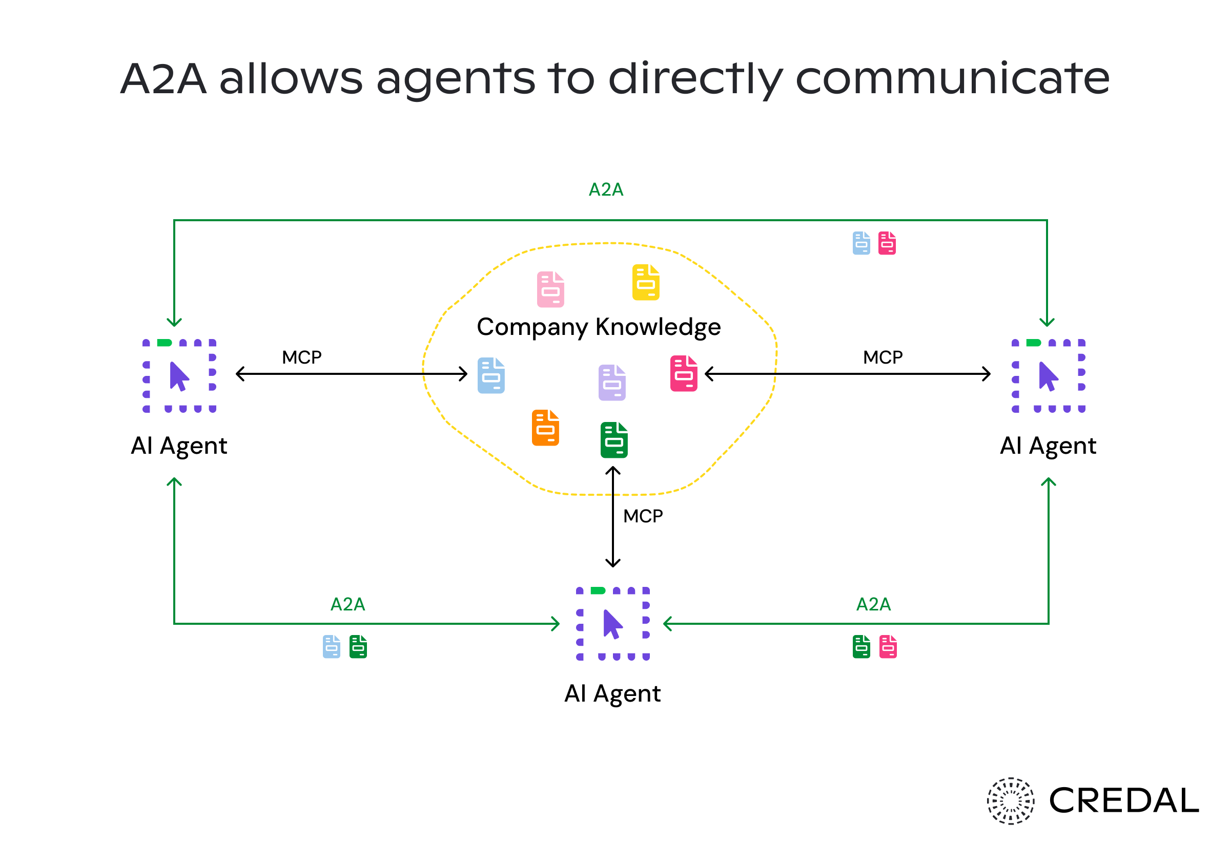 A2A (Agent-to-Agent) is a protocol developed by Google that enables effective communication between AI agents in multi-agent systems. The goal of A2A is to standardize how agents interact with each other through structured message formats that include task specifications, context pointers, and correlation IDs.