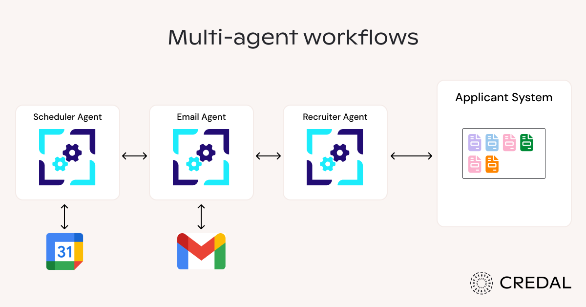 Having specialized agents doesn’t limit what can be done with AI; in fact, it expands it. For instance, imagine a recruiting agent whose job is to screen resumes and schedule follow-up interviews. That recruiting agent is focused on different contexts: the company’s hiring philosophy, the company’s job openings, and hiring platform’s candidates. However, a recruiting agent might need to send an email to schedule a follow-up, to do so, instead of learning all the redundant information of the email agent, it’ll instead interface with the email agent. And just like that, we have an effective multi-agent workflow!