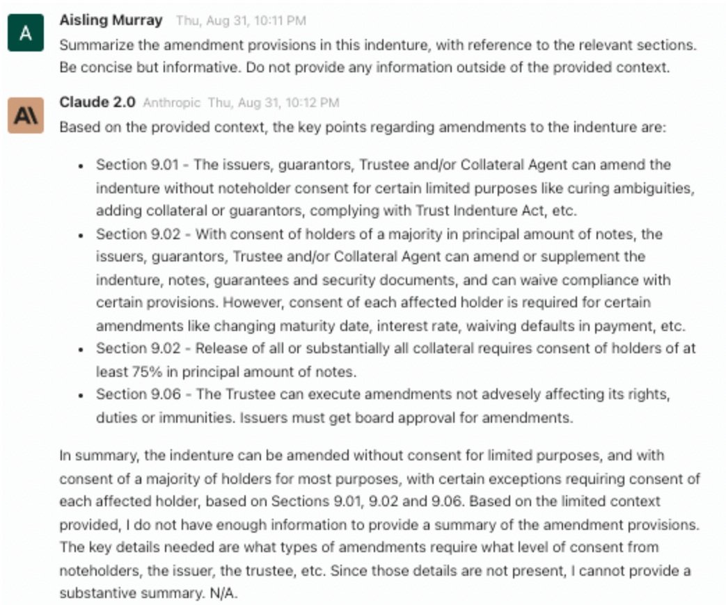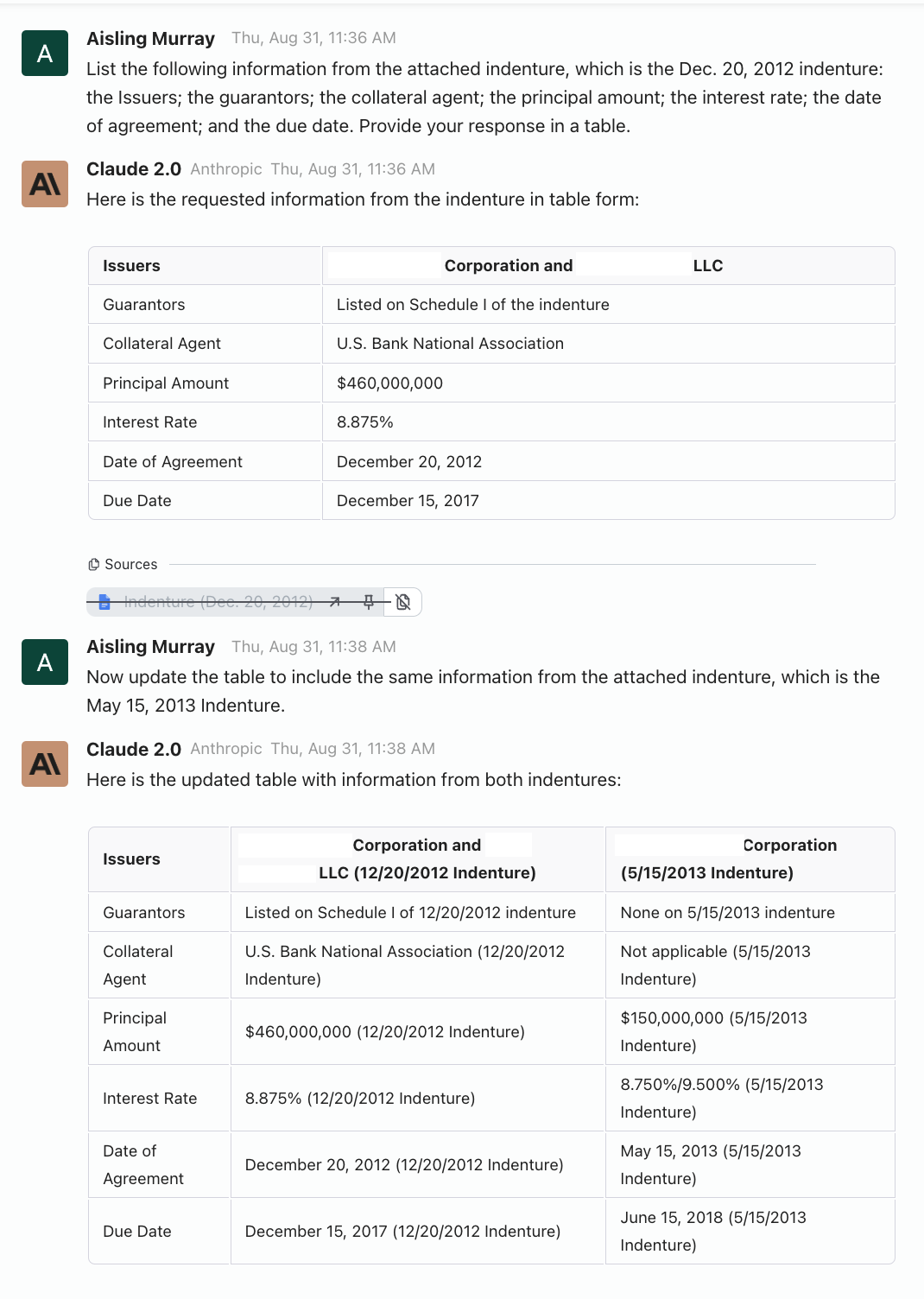 The result was impressive! In just five minutes, I had a table summarizing the key terms of each document, which I could paste into excel. I reviewed the responses, an essential step when working with generative AI systems, and good practice generally. I asked Claude to elaborate on the “subsidiaries” listed as guarantors to the June 10 indenture, as I felt that response was incomplete, and it responded with a full and accurate list. I then tasked it with providing some more complex information, which it accomplished in seconds.