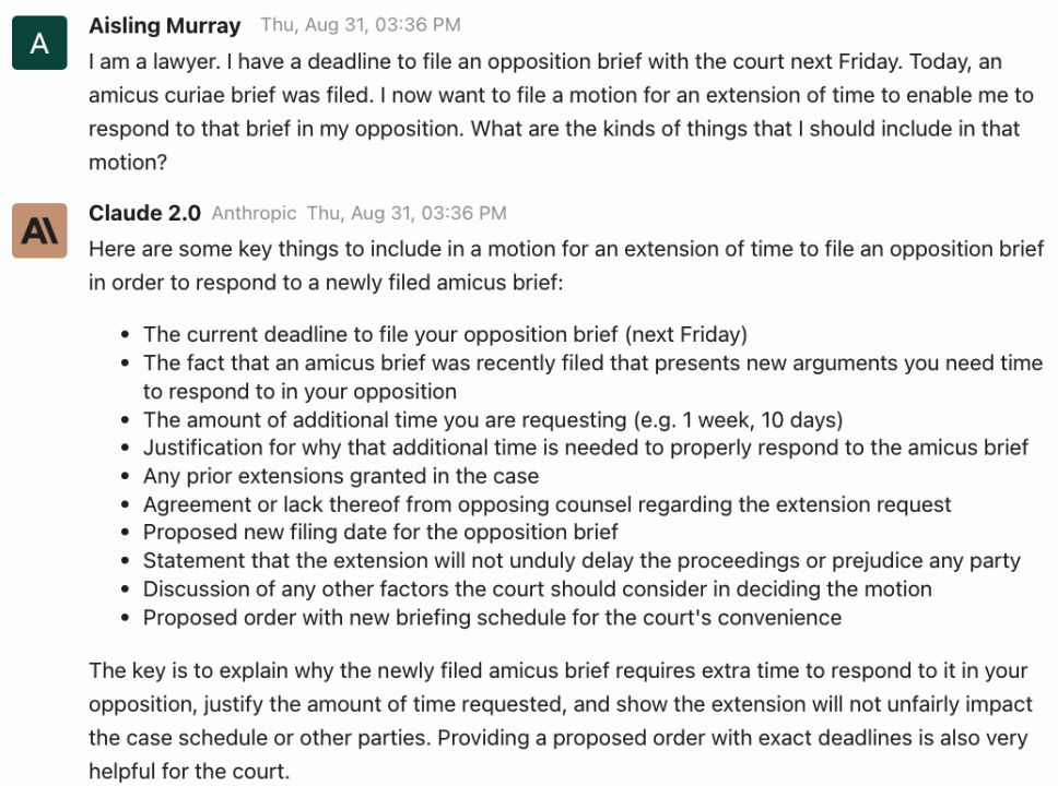 AI tools can also provide powerful support when it comes to brainstorming ideas or navigating new tasks. This holds especially true in a world that embraces remote work; having an AI assistant can be a crucial resource where junior associates can no longer reliably find a mentor in the next office. These tools can provide ideas, answer questions, or suggest a structure for written work. In the next example, I asked Claude how I might go about drafting a motion requesting extension of a deadline.