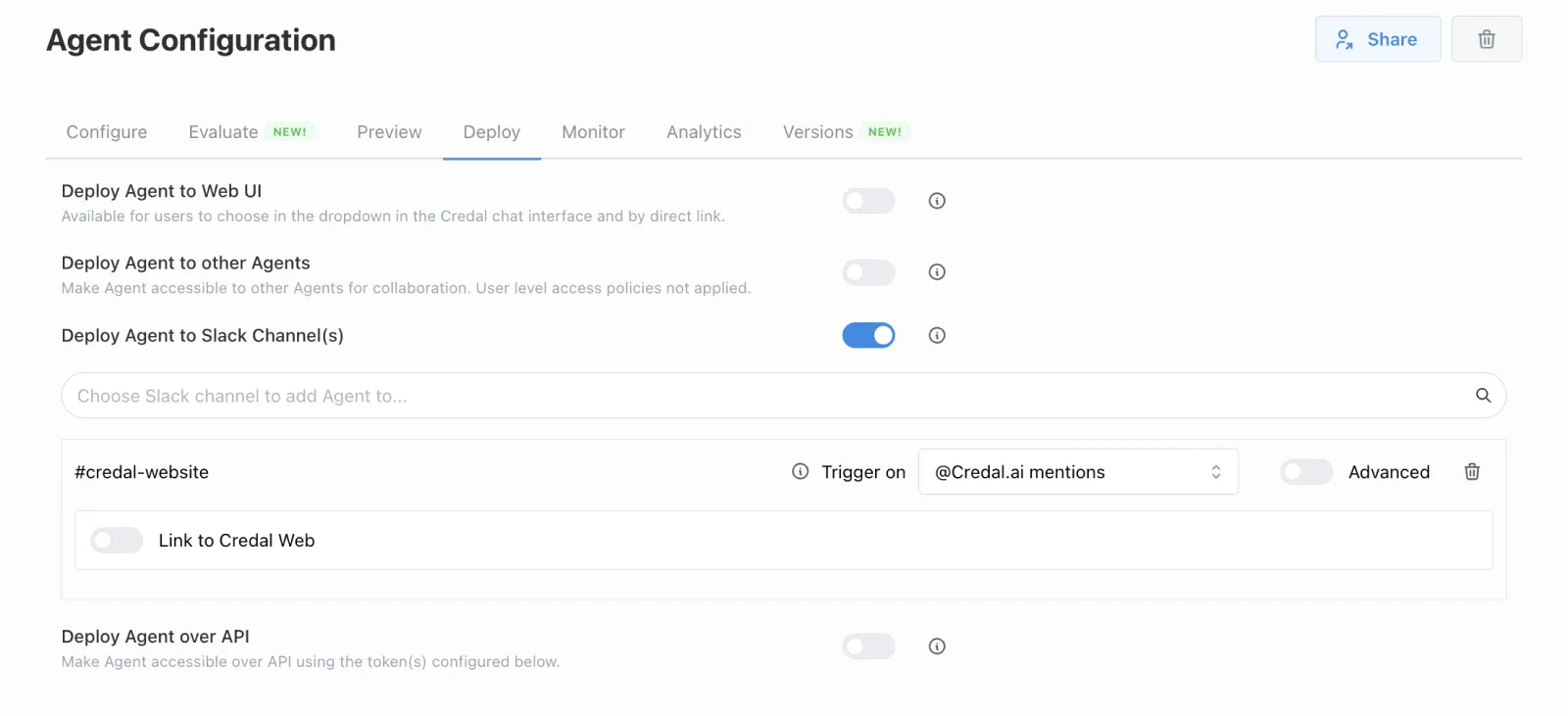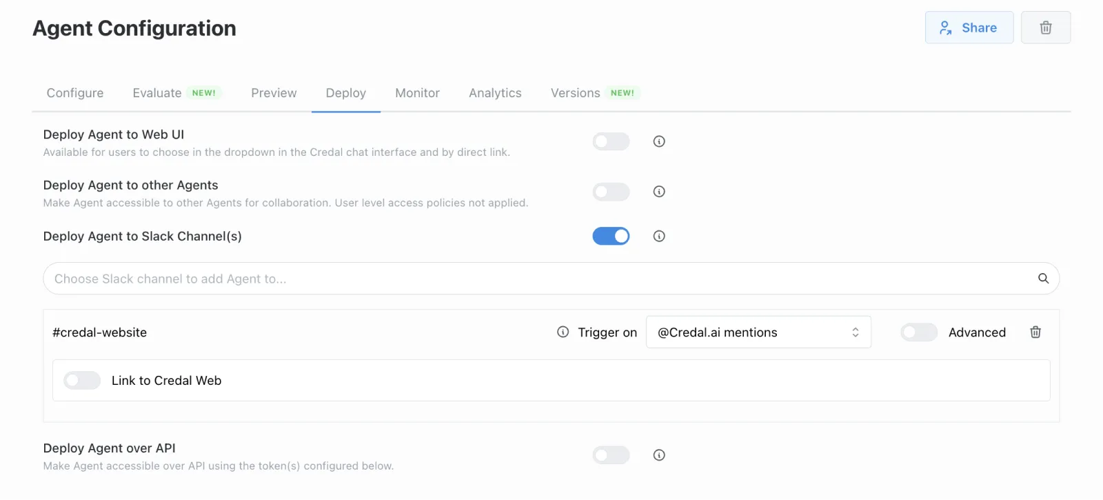After building your agent, navigate to the “Deploy” tab, toggle on the “Deploy Agent to Slack Channel(s)