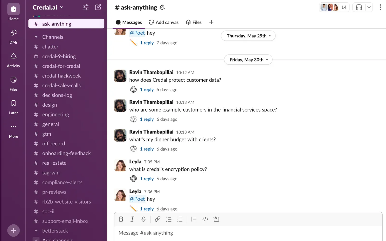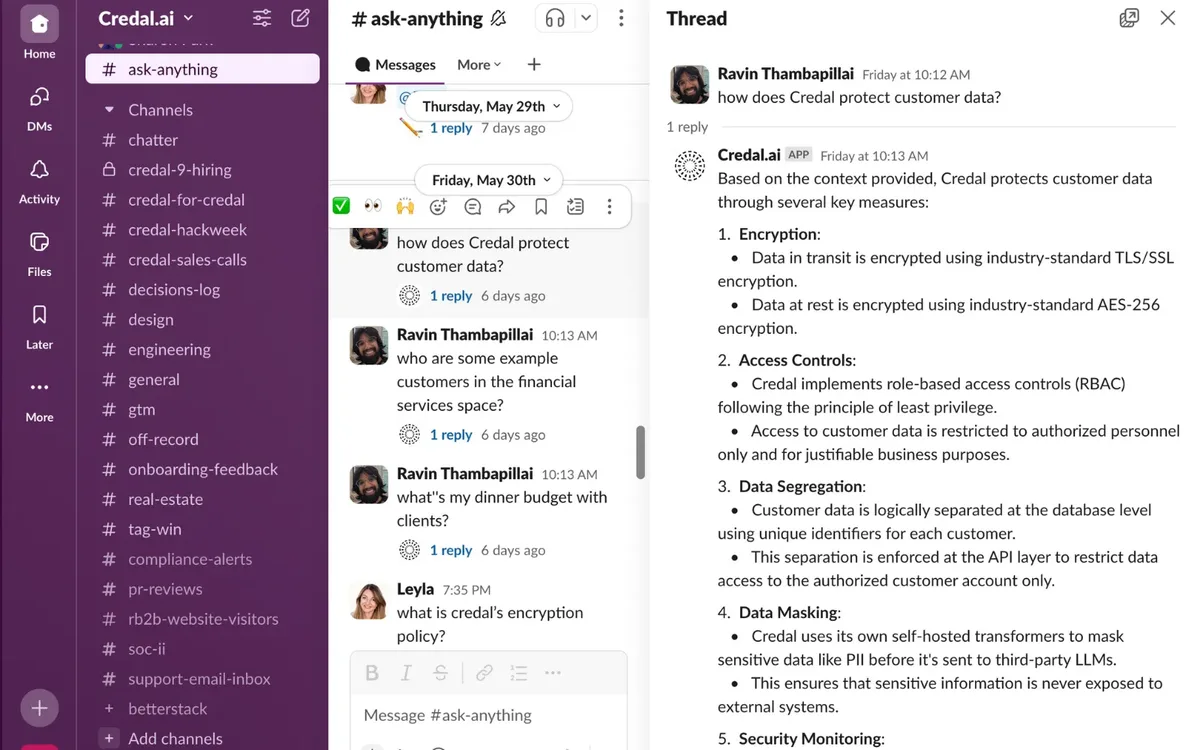 After deploying, you should be able to mention “@credal” in the designated Slack channel to query your agent.