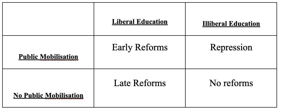 “In brief, this model has as its dependent variable, political liberalisation. The independent variables influencing the outcomes are; 1) the presence of mass public opposition to the monarchy and 2) the King’s education, (whether it was foreign/liberal or domestic). The two key actors are the ruling monarch and political opposition, which may consist of social groups and or political parties. The argument forms three stages, which are summarized as propositions above and in graphical form in figure 1 below.”