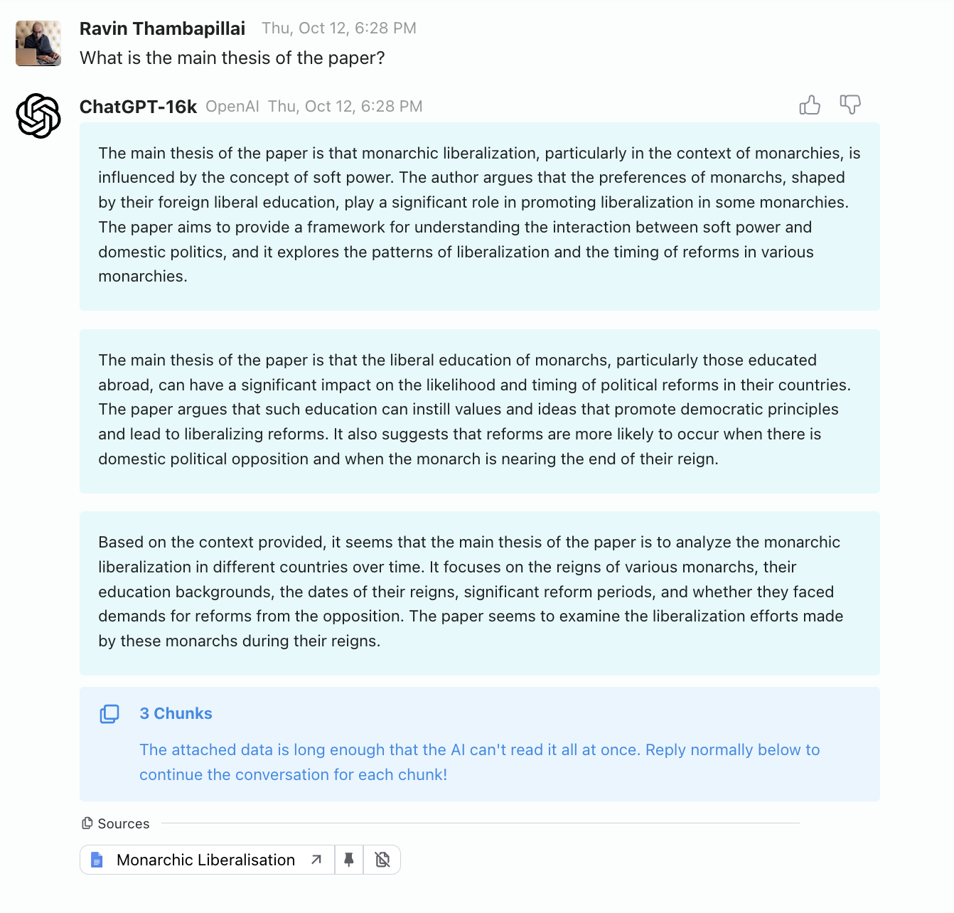 Although this seems like a simple question, it’s tricky because the part of the paper that presents the main thesis never mentions the words “main thesis”. In fact, it doesn’t even mention anything similar to those words. This is a great example of the difference between the demo version - where you get to pick the exact wording of a question - and the real version, where you have thousands of users, so you see very diverse ways of asking the same question.