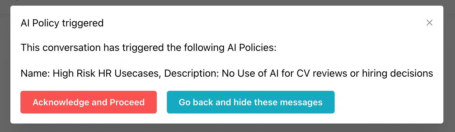 An example warning in Credal when a user tries to use a Large Language Model in a way that is not considered an appropriate use by the Enterprise IT administrators.