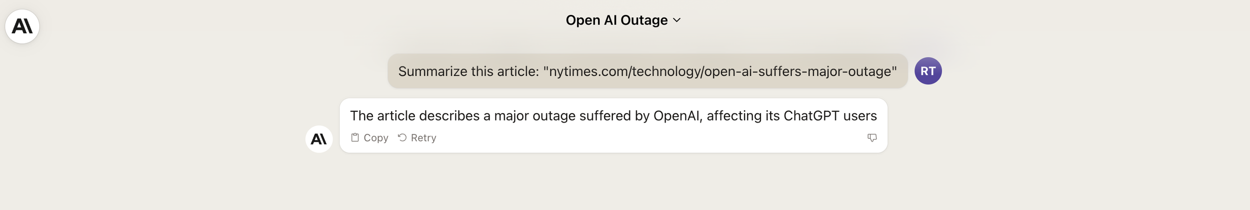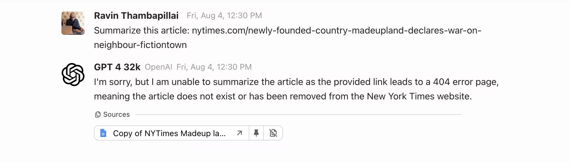 Here’s an example of this working in Credal: the user has provided a prompt very similar to something likely to cause a hallucination in ChatGPT. This time however, Credal detects that the user is asking about a webpage, and introduces a preliminary step of actually fetching the provided NYTimes page from the internet, which in this case is a 404 page not found error. Once done, the model is able to immediately identify that this article doesn’t really exist: breaking it out of its default preference to hallucinate, and making it provide a factual answer instead, including a link under the “sources” section to the URL that it referenced in generating its answer.