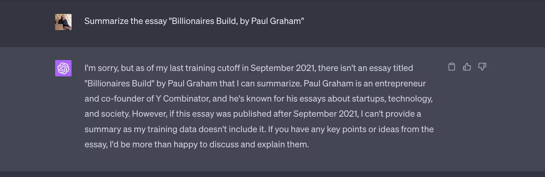 This well known essay was written well before GPT 4’s cut off in September 2021. But because ChatGPT had such a big problem with hallucination when asked to summarize specific articles or websites, some people have speculated that OpenAI fine-tuned it in ways that cause it to avoid answering these questions, even when it really ought to know the content of the article, thereby making it slightly less helpful in certain circumstances.