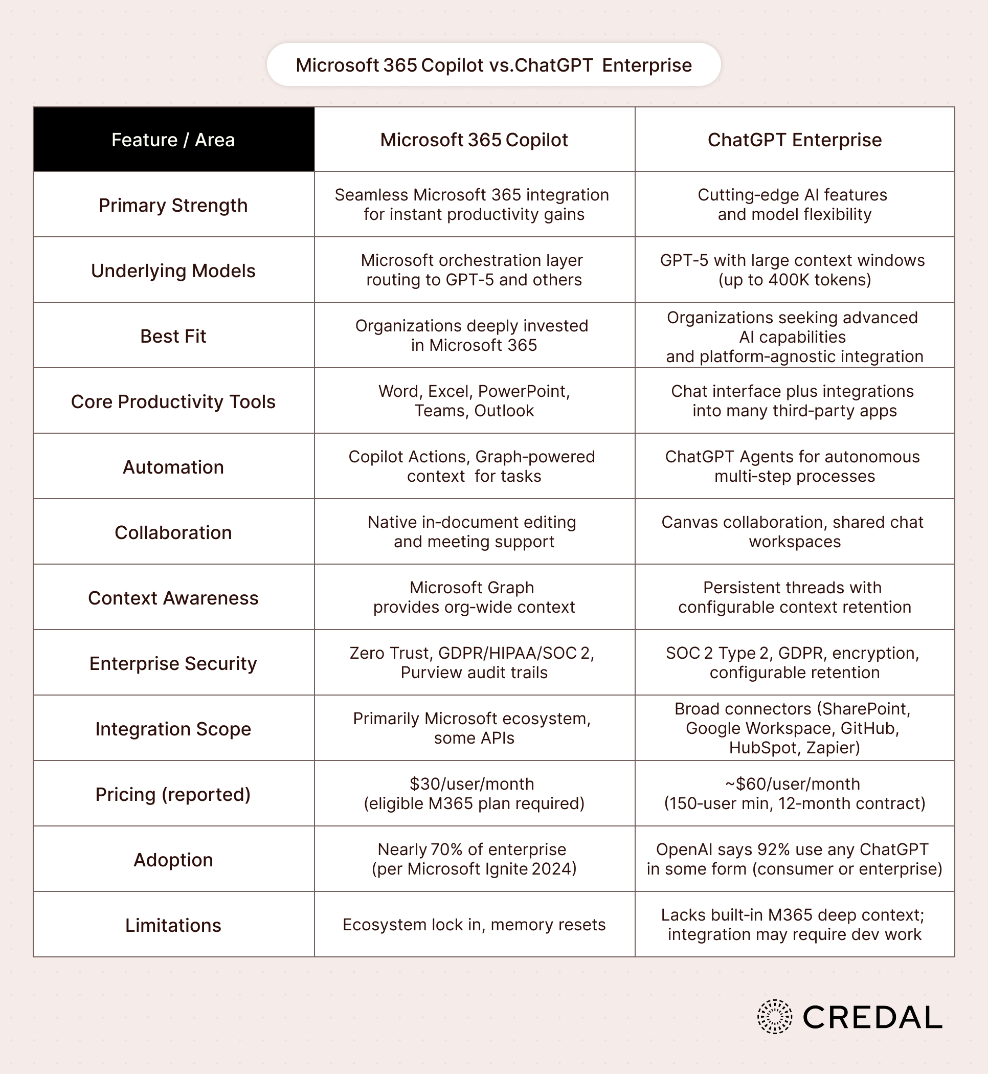 While ChatGPT is an ubiquitous tool that most professionals have tried, companies procure Microsoft Copilot because they heavily rely on the Microsoft 365 stack. For these organizations, relying on an external platform like ChatGPT Enterprise would forces employees to constantly context-switch between two tools, creating friction. Instead, Microsoft 365 enables AI across the board—a better solution to rolling out company-wide AI access, whether inspired by a top-down decision by corporate or a bottoms-up shadow IT reason.