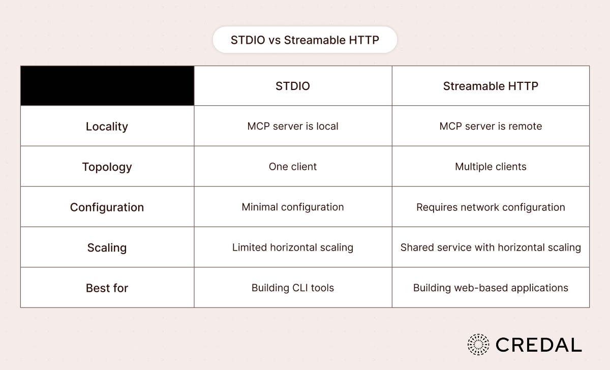 At a high-level, there are some main differences between STDIO and Streamable HTTP.