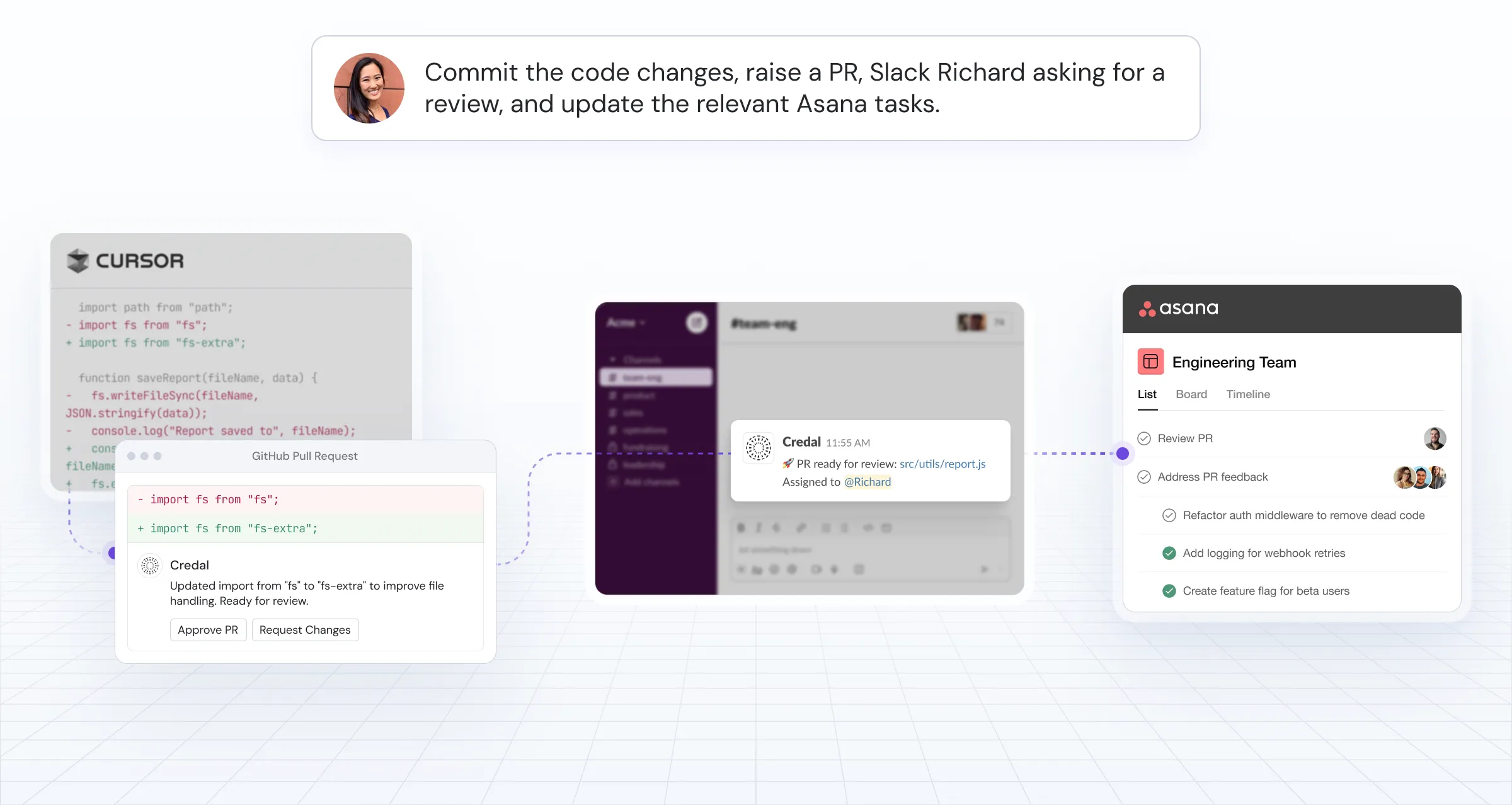 Each team’s workflow is powered by Credal agents that extend into leading chat and workflow tools, so value shows up where teams already collaborate.