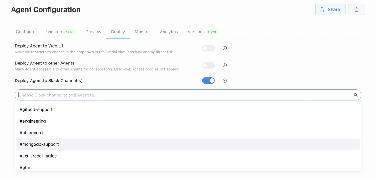 After building your agent, navigate to the “Deploy” tab, toggle on the “Deploy Agent to Slack Channel(s)
